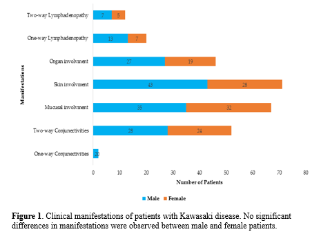 Clinical manifestations of patients at the time of admission, including conjunctivitis, mucosal involvement, skin involvement, organ involvement, and lymphadenopathy, were obtained from their records (Figure 1). No significant differences were observed between the two sexes based on clinical manifestations (P-value <0.05).