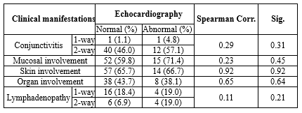 The relationship between variables was measured to assess the risk factors for coronary artery involvement and abnormal echocardiographic findings. The results showed no significant relationship between clinical manifestations and abnormal echocardiographic findings (Table 3).
