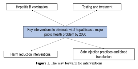 The key interventions include (but are not limited to) immunization, safe injection and blood transfusion, harm reduction interventions, testing, early diagnosis, prompt treatment, and community participation (Figure 1).